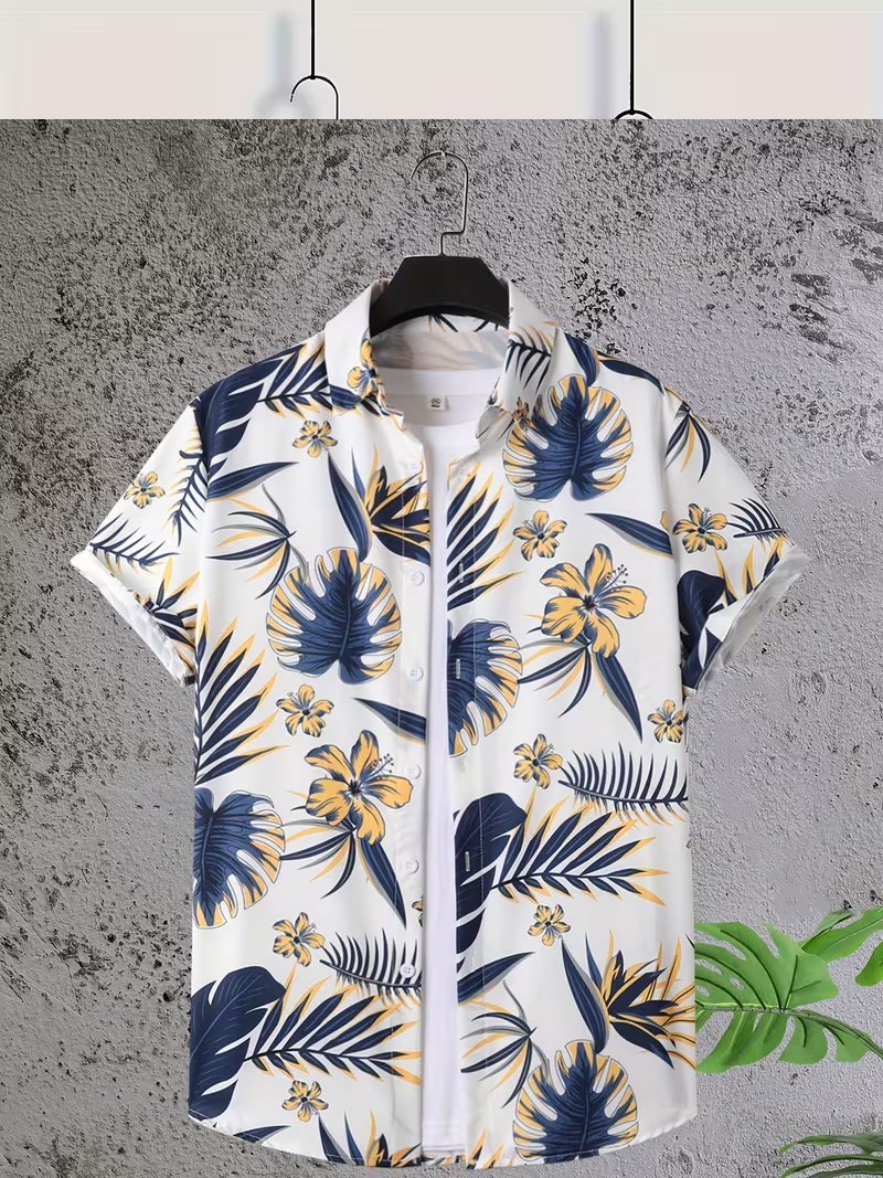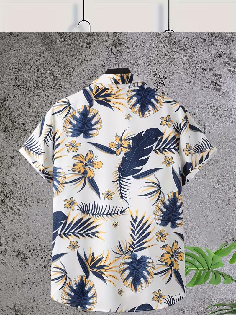 Apportez une touche de fraîcheur et d’élégance à votre dressing d’été avec cette chemise homme à imprimé tropical . Son fond blanc lumineux est sublimé par des motifs feuillages et fleurs bleu marine et jaune, pour un style à la fois moderne et ensoleillé.